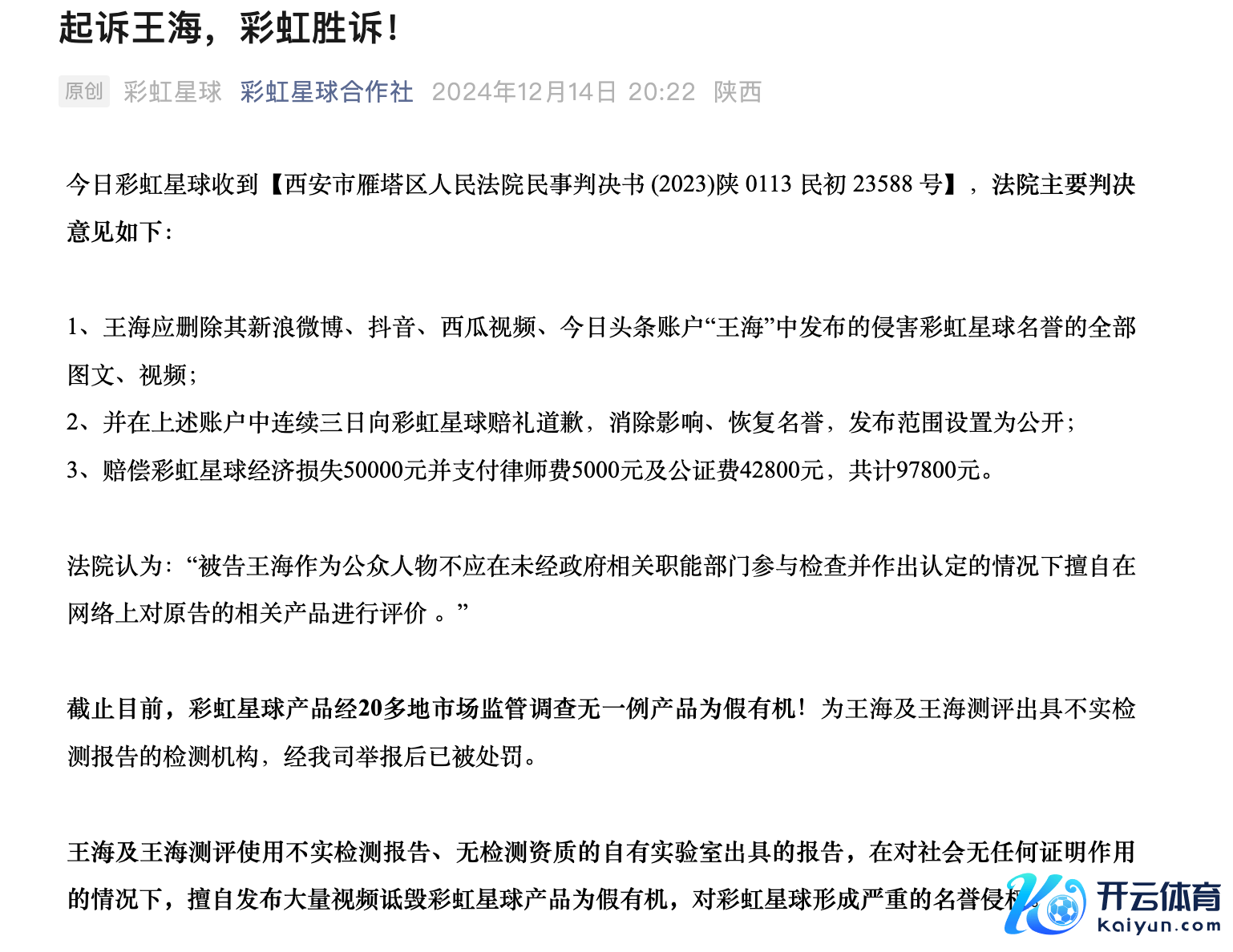 12月14日晚间,网红品牌“彩虹星球”在其微信公众号“彩虹星球互助社”发布著作,称收到西安市雁塔区东说念主民法院的一审民事判决书【(2023)陕0113民初23588号】。著作中还称,松手现在,公司居品经20多地市集监管探望无一例居品为假有机,“为王海及王海测评出具乌有检测汇报的检测机构,经我司举报后已被处罚”。