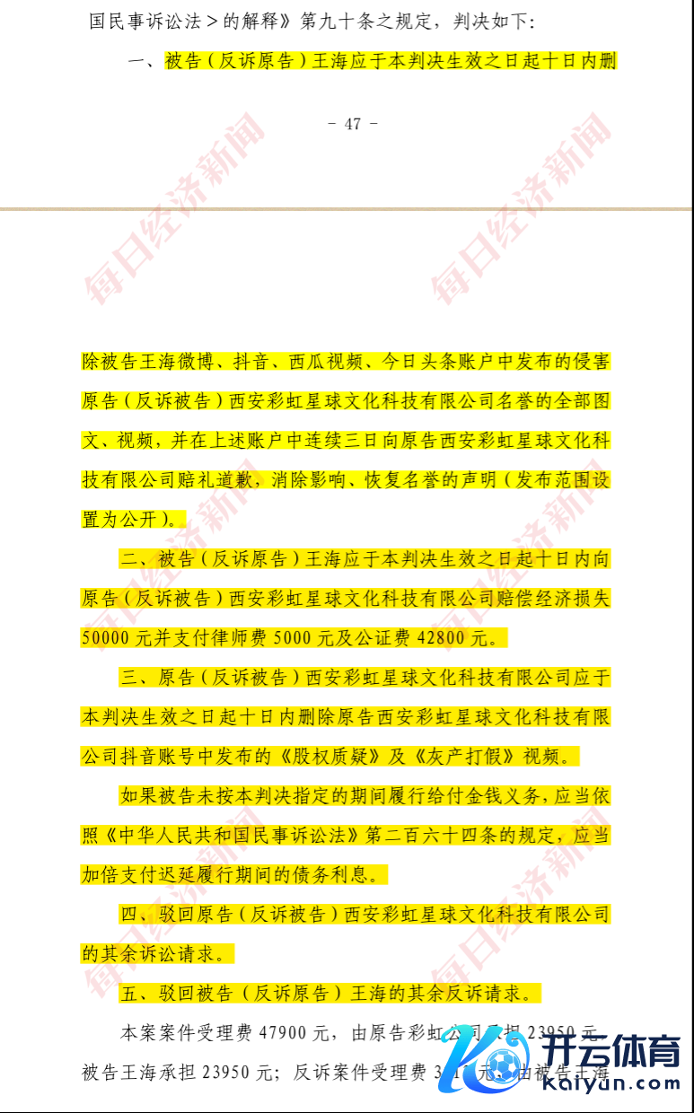 一、被告(反诉原告)王海应于本判决收效之日起旬日内删除被告王海微博、抖音、西瓜视频、当天头条账户中发布的侵害原告(反诉被告)西安彩虹星球文化科技有限公司名誉的一齐图文、视频,并在上述账户中麇集三日向原告西安彩虹星球文化科技有限公司赔礼说念歉,搁置影响、规复名誉的声明(发布规模设立为公开)。